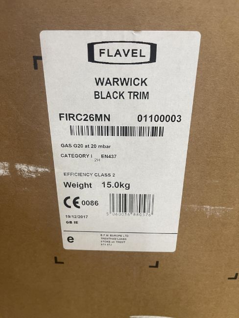 Boxed Flavel Warwick Black Trim FIRC26MN Gas Fire as Lotted Please Note: It is the responsibility of the purchaser to safely dismantle & remove their lots from their existing location, there will be no assistance in any form from Gavel Staff, purchasers are required to use their own tools, manpower & vehicles to remove their lots within the allocated collection time frame