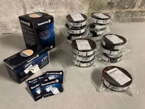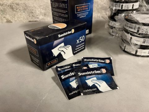 Quantity of Sundstrom Sundries Comprising; 17no. Sundstrom Replacement Filters to Fit SR510 Mask, 1no. Box of 50no. Sundstrom SR5226 Cleaning Tissues & 1no. Box of 16 x 5 SR221 Pre Filters, Lot Location: Upper Building