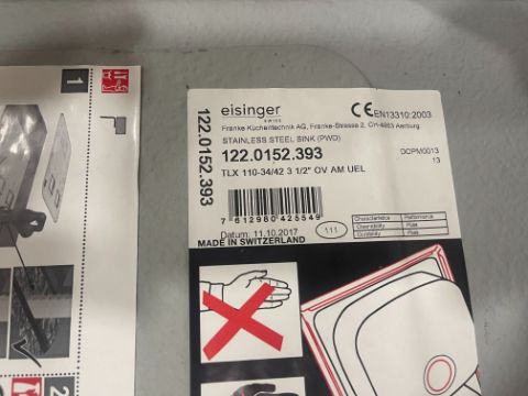 Boxed Frankie Strasse 2 Stainless Steel Sink, Lot Location: Showroom. Please Note: It is the responsibility of the purchaser to safely dismantle & remove their lots from their existing location, there will be no assistance in any form from Gavel Staff, purchasers are required to use their own tools, manpower & vehicles to remove their lots within the allocated collection time frame